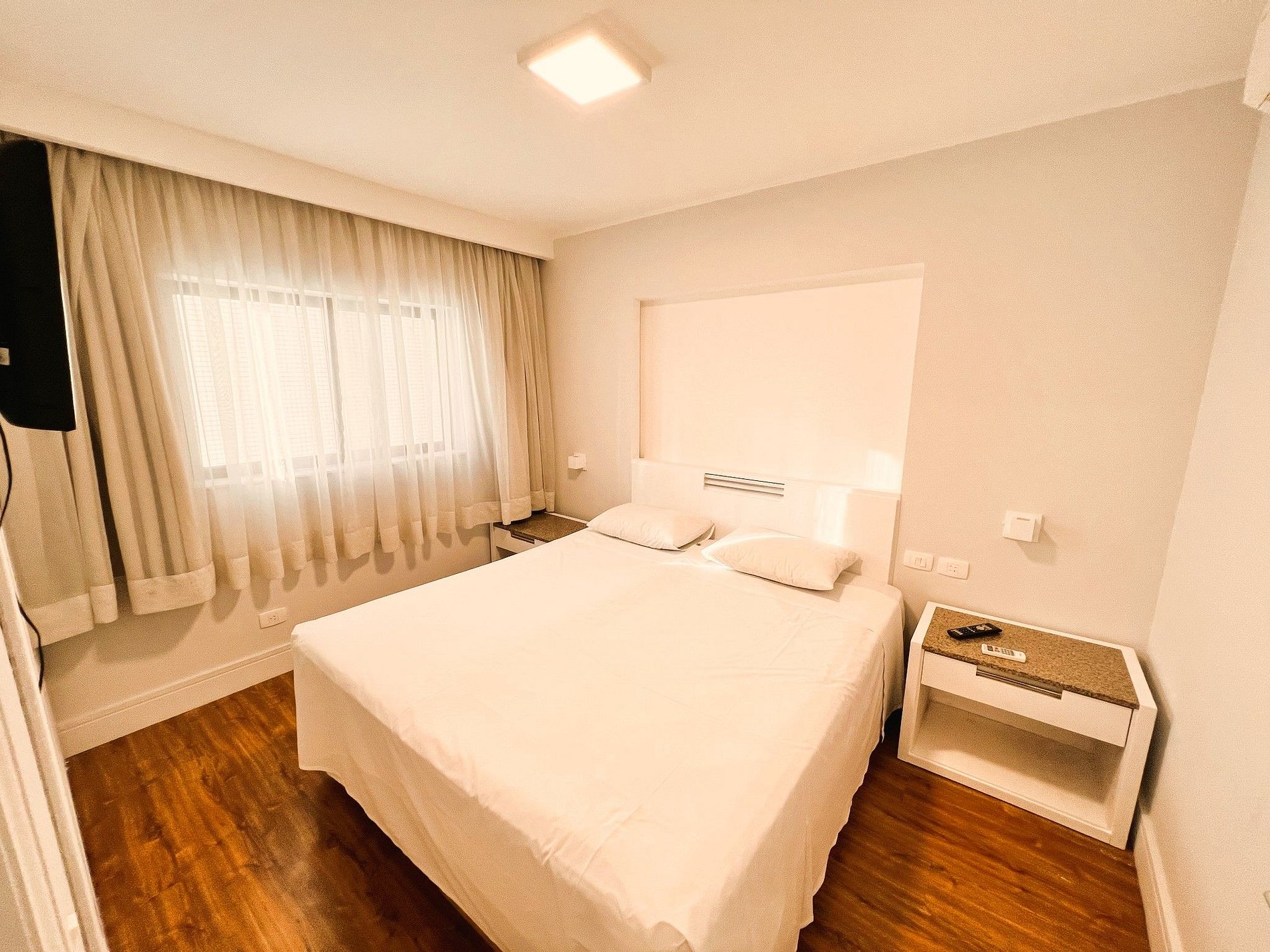 O flat dispõe de uma cama queen size e sofá-cama queen size muito confortáveis. Também conta com ar-condicionado quente/frio, frigobar, microondas, fogão elétrico e utensílios básicos de cozinha. O apartamento fica inteiro e exclusivo só para a pessoa que fez a reserva e seus familiares. Não existe possibilidade de uma pessoa de fora reservar o apartamento ao mesmo tempo para dividi-lo. São fornecidos lençóis, toalhas e cobertores. No edifício, há um restaurante que oferece café-da-manhã (cobrado à parte). Horários de funcionamento: de segunda a sábado, das 7h00 às 10h00 (café-da-manhã) e das 11h30 às 14h30 (almoço). Cada reserva dá direito ao estacionamento gratuito de um veículo de tamanho médio por apartamento (sujeito a disponibilidade). Não há uma vaga específica, pois o estacionamento é rotativo e o motorista estaciona em uma vaga livre e leva a chave. Algumas vagas são maiores e cabem uma S.U.V., mas por ser o estacionamento rotativo não é possível garantir que haverá vagas grandes livres. Caso o veículo seja grande e não haja espaço, há vários estacionamentos na região. Ressaltamos que há menos vagas do que apartamentos, então não há garantia de vaga para todos, sendo que aqueles que chegam mais cedo (em geral, antes das 18h) têm muito mais chance de encontrar vagas.