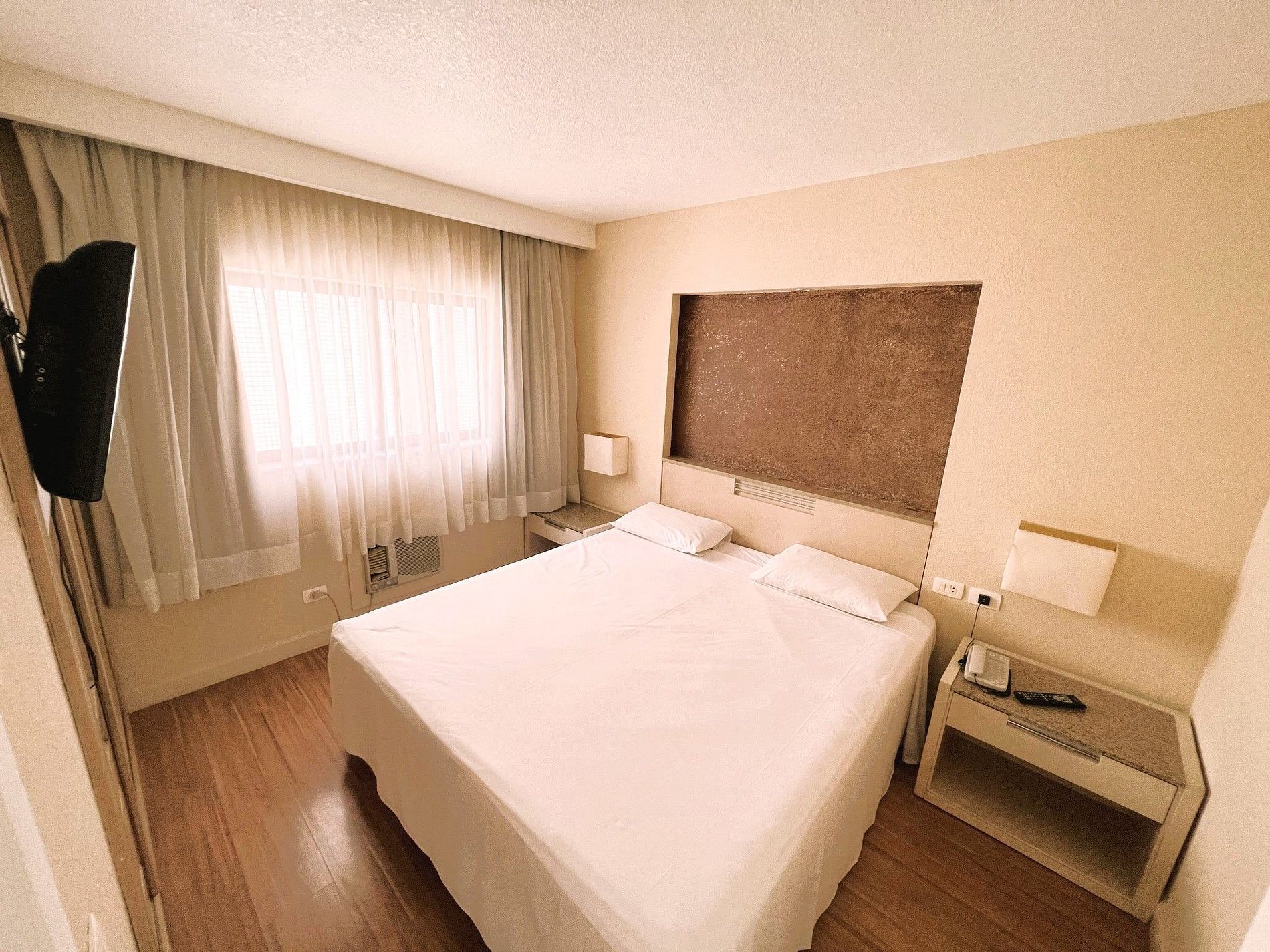 O flat dispõe de uma cama king size e um colchão de solteiro muito confortável, que podem ser colocados no espaço comum ou no quarto. Também conta com ar-condicionado quente/frio, frigobar, microondas e utensílios básicos de cozinha. O apartamento fica inteiro e exclusivo só para a pessoa que fez a reserva e seus familiares. Não existe possibilidade de uma pessoa de fora reservar o apartamento ao mesmo tempo para dividi-lo. São fornecidos lençóis, toalhas e cobertores. No edifício, há um restaurante que oferece café-da-manhã (cobrado à parte). Horários de funcionamento: de segunda a sábado, das 7h00 às 10h00 (café-da-manhã) e das 11h30 às 14h30 (almoço). Cada reserva dá direito ao estacionamento gratuito de um veículo de tamanho médio por apartamento (sujeito a disponibilidade). Não há uma vaga específica, pois o estacionamento é rotativo e o motorista estaciona em uma vaga livre e leva a chave. Algumas vagas são maiores e cabem uma S.U.V., mas por ser o estacionamento rotativo não é possível garantir que haverá vagas grandes livres. Caso o veículo seja grande e não haja espaço, há vários estacionamentos na região. Ressaltamos que há menos vagas do que apartamentos, então não há garantia de vaga para todos, sendo que aqueles que chegam mais cedo (em geral, antes das 18h) têm muito mais chance de encontrar vagas.