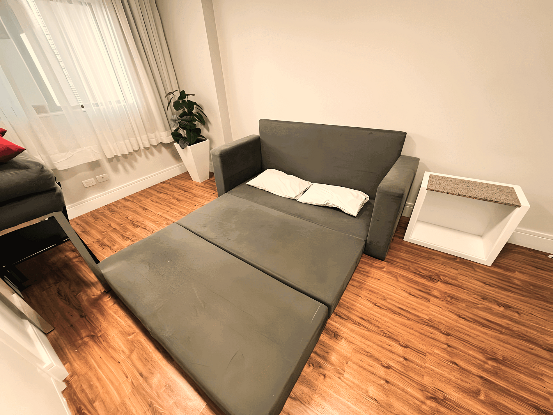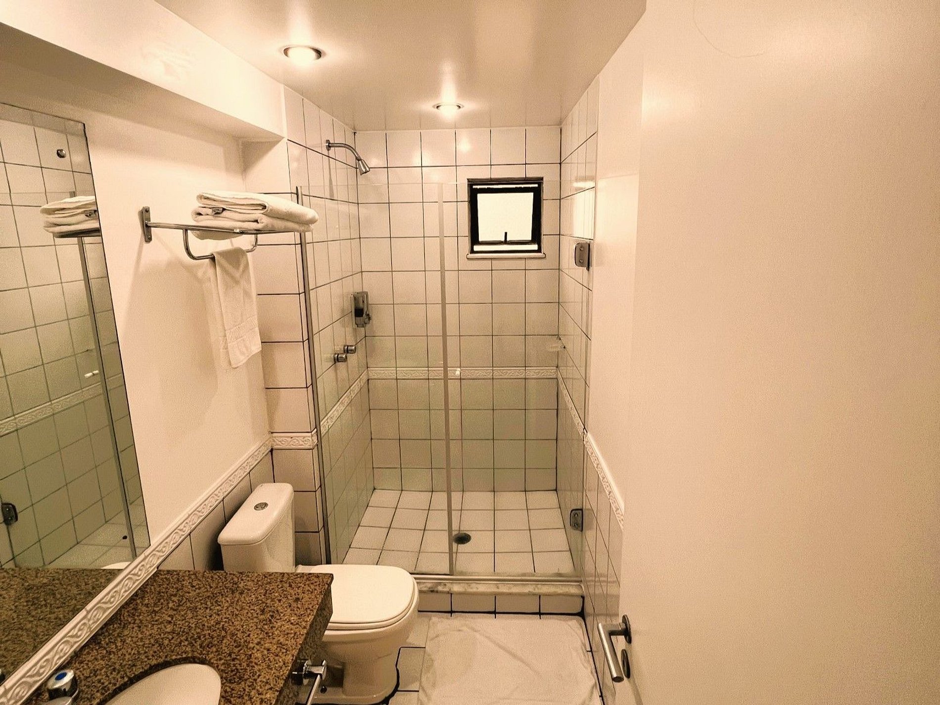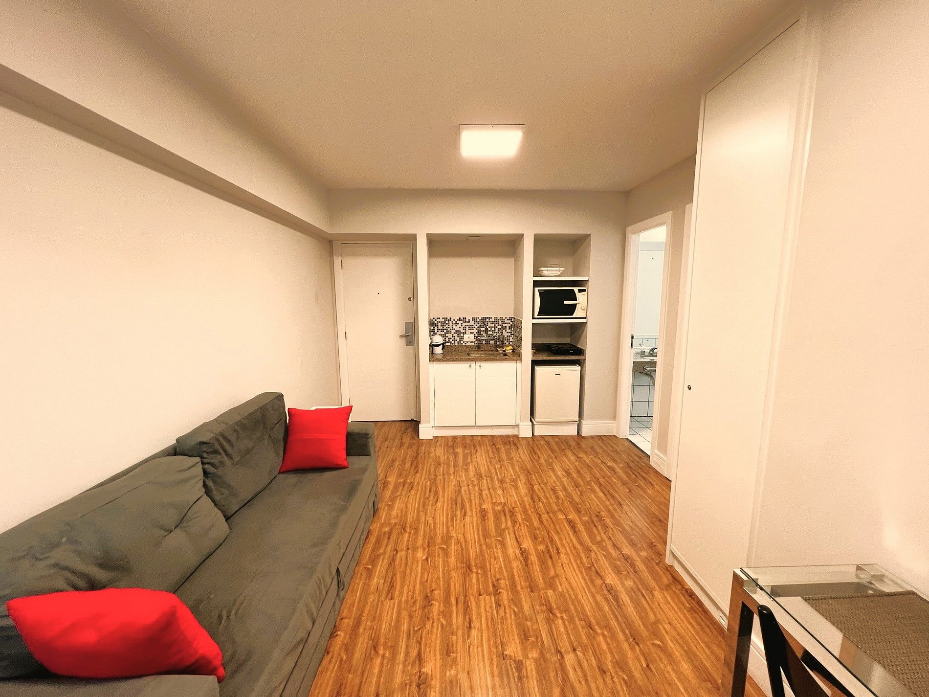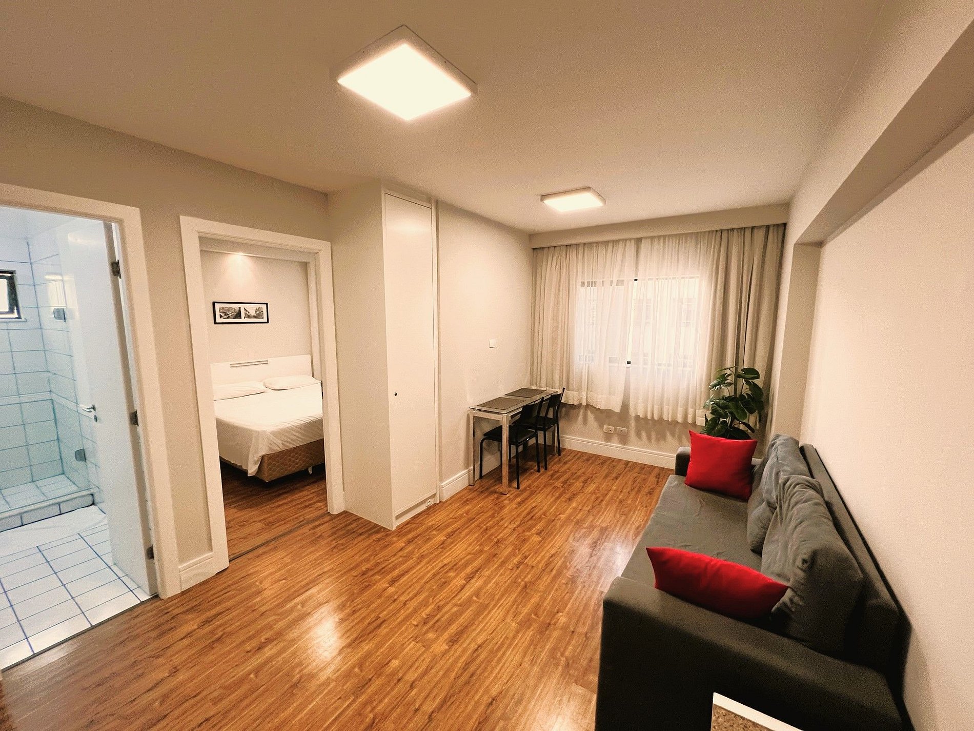 O flat dispõe de uma cama queen size e e um sofá-cama queen size muito confortáveis. Também conta com ar-condicionado quente/frio, frigobar, microondas, fogão elétrico e utensílios básicos de cozinha. O apartamento fica inteiro e exclusivo só para a pessoa que fez a reserva e seus familiares. Não existe possibilidade de uma pessoa de fora reservar o apartamento ao mesmo tempo para dividi-lo. São fornecidos lençóis, toalhas e cobertores. No edifício, há um restaurante que oferece café-da-manhã (cobrado à parte). Horários de funcionamento: de segunda a sábado, das 7h00 às 10h00 (café-da-manhã) e das 11h30 às 14h30 (almoço). Cada reserva dá direito ao estacionamento gratuito de um veículo de tamanho médio por apartamento (sujeito a disponibilidade). Não há uma vaga específica, pois o estacionamento é rotativo e o motorista estaciona em uma vaga livre e leva a chave. Algumas vagas são maiores e cabem uma S.U.V., mas por ser o estacionamento rotativo não é possível garantir que haverá vagas grandes livres. Caso o veículo seja grande e não haja espaço, há vários estacionamentos na região. Ressaltamos que há menos vagas do que apartamentos, então não há garantia de vaga para todos, sendo que aqueles que chegam mais cedo (em geral, antes das 18h) têm muito mais chance de encontrar vagas.