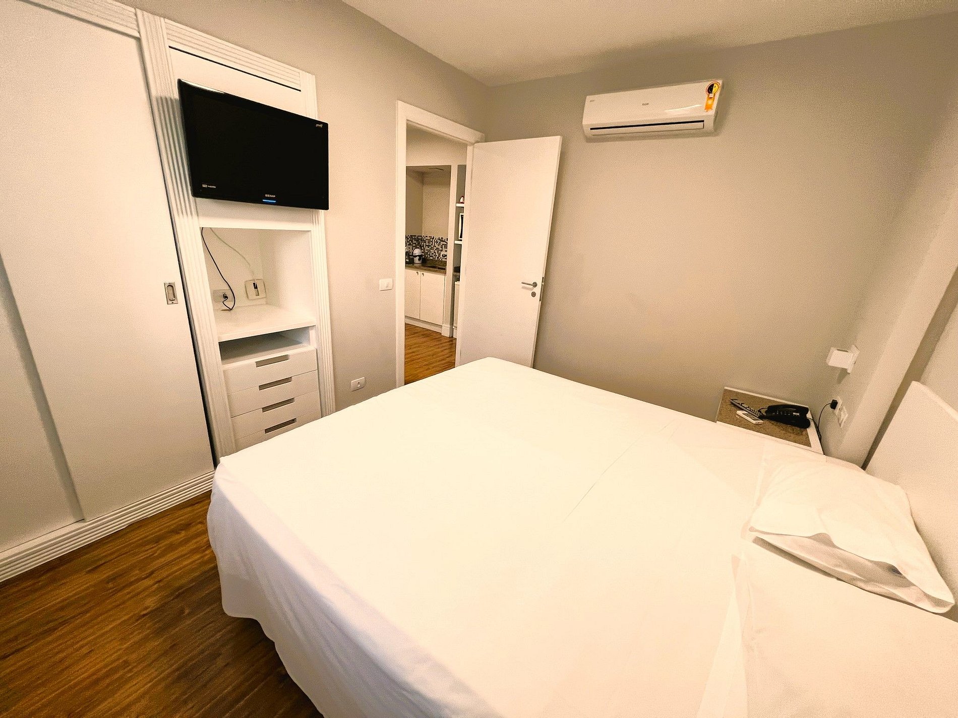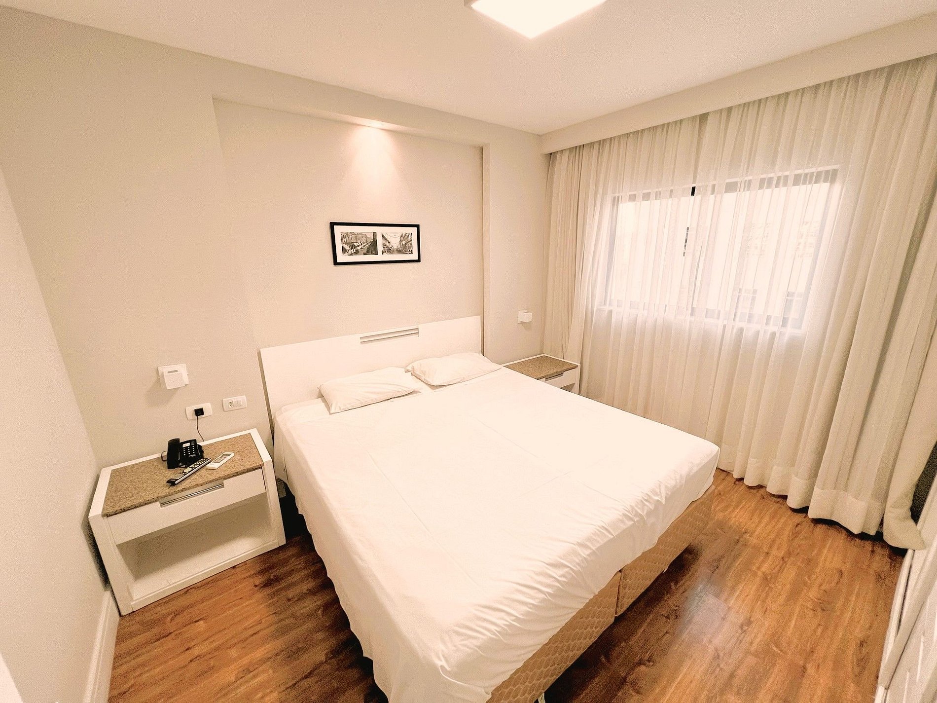 O flat dispõe de uma cama queen size e e um sofá-cama queen size muito confortáveis. Também conta com ar-condicionado quente/frio, frigobar, microondas, fogão elétrico e utensílios básicos de cozinha. O apartamento fica inteiro e exclusivo só para a pessoa que fez a reserva e seus familiares. Não existe possibilidade de uma pessoa de fora reservar o apartamento ao mesmo tempo para dividi-lo. São fornecidos lençóis, toalhas e cobertores. No edifício, há um restaurante que oferece café-da-manhã (cobrado à parte). Horários de funcionamento: de segunda a sábado, das 7h00 às 10h00 (café-da-manhã) e das 11h30 às 14h30 (almoço). Cada reserva dá direito ao estacionamento gratuito de um veículo de tamanho médio por apartamento (sujeito a disponibilidade). Não há uma vaga específica, pois o estacionamento é rotativo e o motorista estaciona em uma vaga livre e leva a chave. Algumas vagas são maiores e cabem uma S.U.V., mas por ser o estacionamento rotativo não é possível garantir que haverá vagas grandes livres. Caso o veículo seja grande e não haja espaço, há vários estacionamentos na região. Ressaltamos que há menos vagas do que apartamentos, então não há garantia de vaga para todos, sendo que aqueles que chegam mais cedo (em geral, antes das 18h) têm muito mais chance de encontrar vagas.