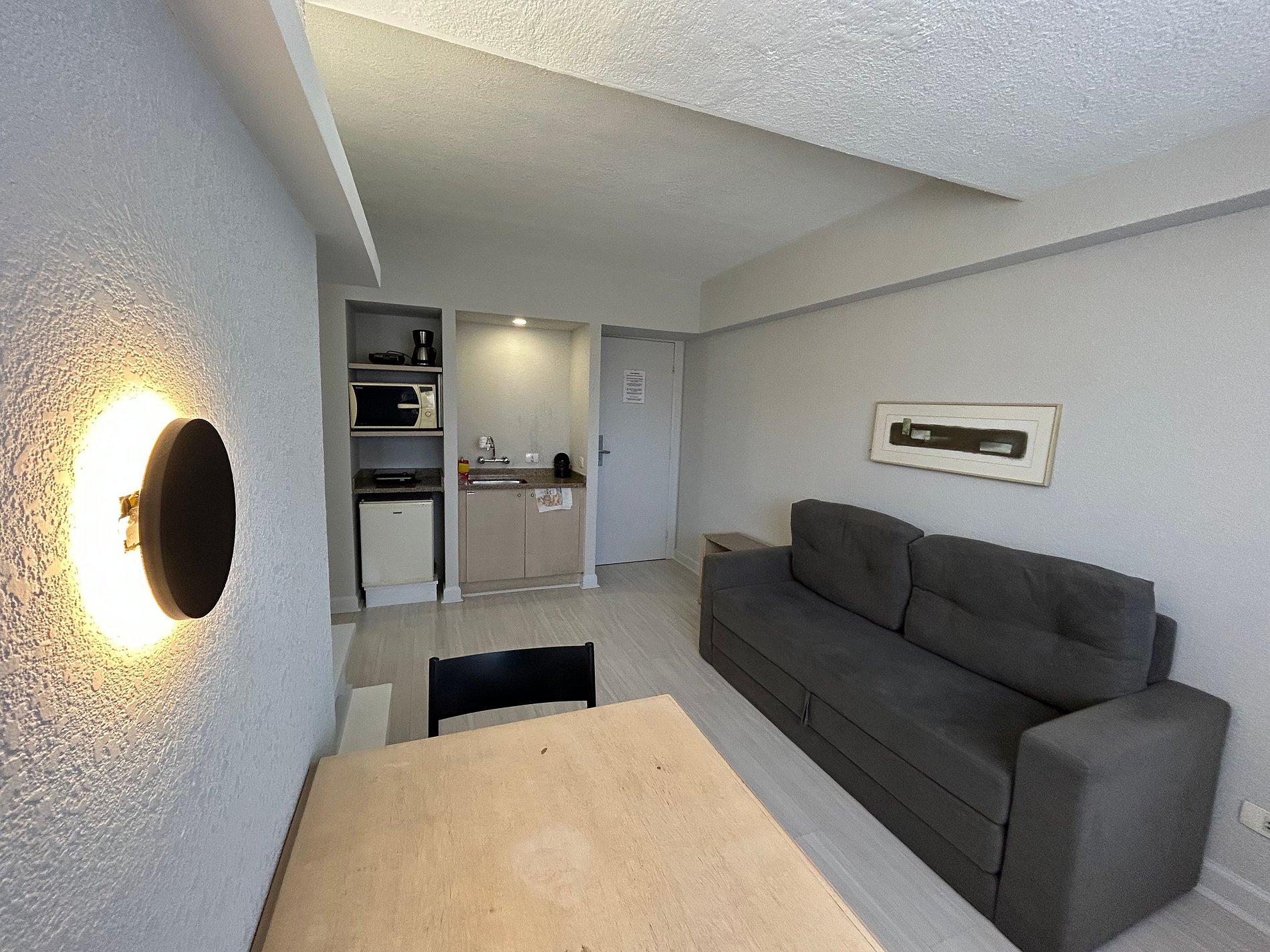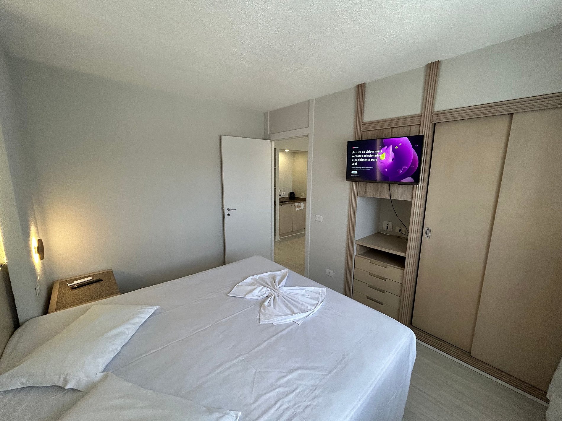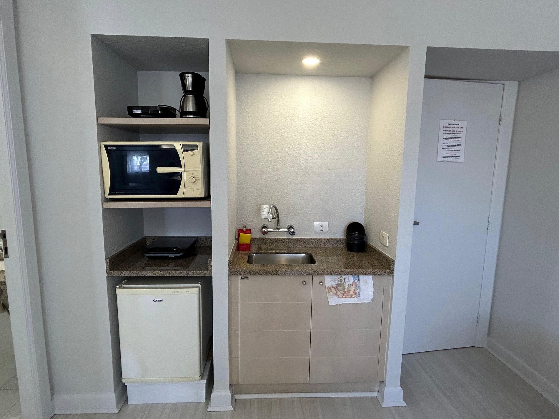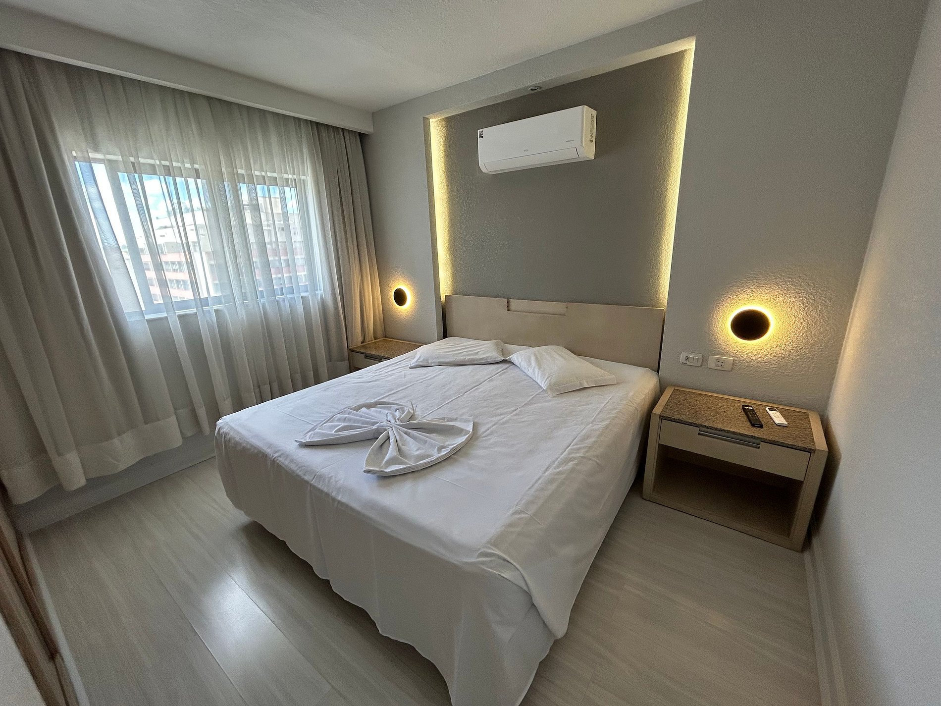 O flat dispõe de uma cama king size e um sofá-cama queen size. Também conta com ar-condicionado quente/frio, frigobar, microondas e utensílios básicos de cozinha. O apartamento fica inteiro e exclusivo só para a pessoa que fez a reserva e seus familiares. Não existe possibilidade de uma pessoa de fora reservar o apartamento ao mesmo tempo para dividi-lo. São fornecidos lençóis, toalhas e cobertores. No edifício, há um restaurante que oferece café-da-manhã (cobrado à parte). Horários de funcionamento: de segunda a sábado, das 7h00 às 10h00 (café-da-manhã) e das 11h30 às 14h30 (almoço). Cada reserva dá direito ao estacionamento gratuito de um veículo de tamanho médio por apartamento (sujeito a disponibilidade). Não há uma vaga específica, pois o estacionamento é rotativo e o motorista estaciona em uma vaga livre e leva a chave. Algumas vagas são maiores e cabem uma S.U.V., mas por ser o estacionamento rotativo não é possível garantir que haverá vagas grandes livres. Caso o veículo seja grande e não haja espaço, há vários estacionamentos na região. Ressaltamos que há menos vagas do que apartamentos, então não há garantia de vaga para todos, sendo que aqueles que chegam mais cedo (em geral, antes das 18h) têm muito mais chance de encontrar vagas.