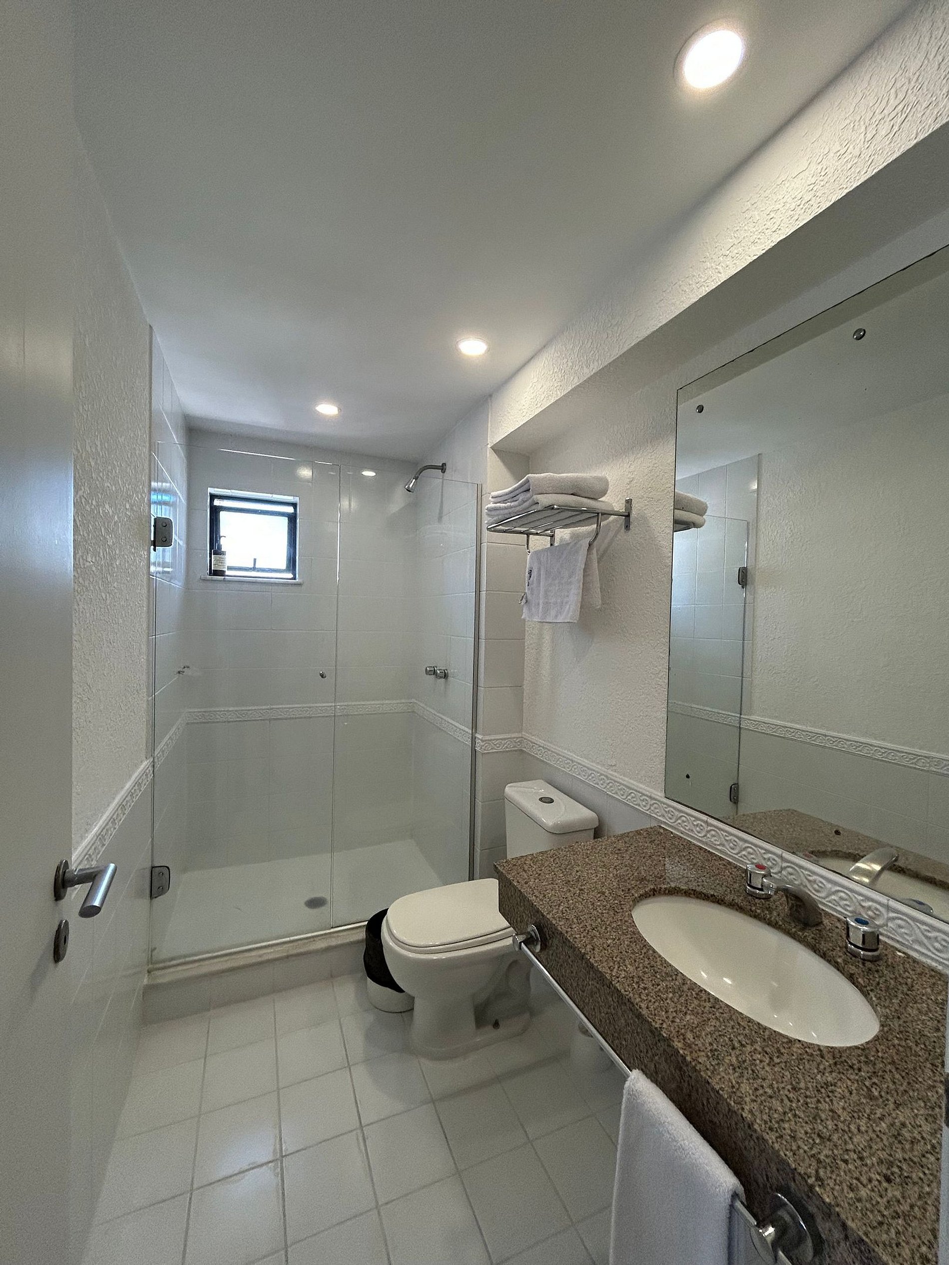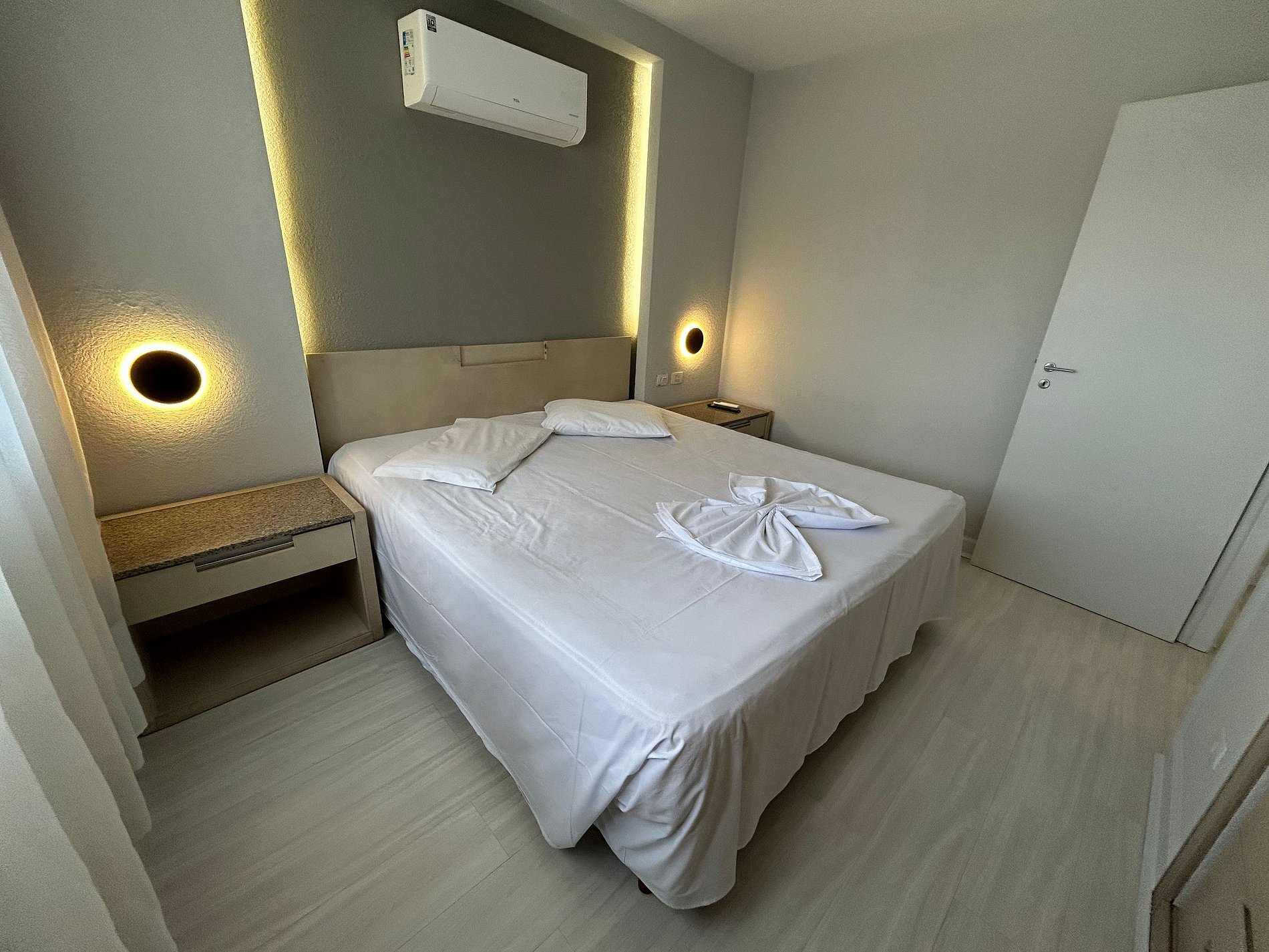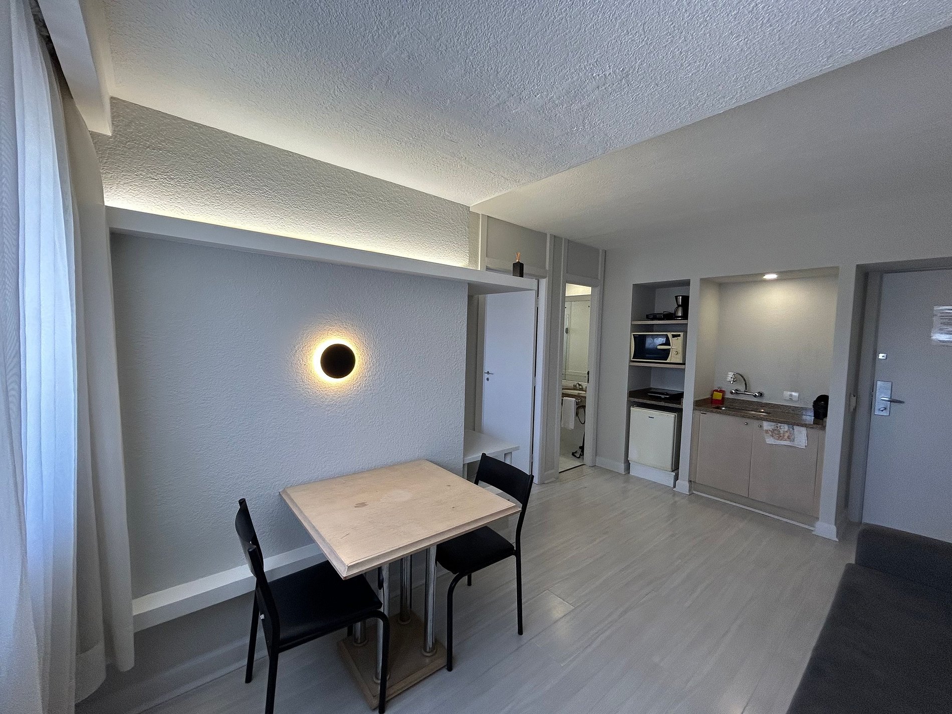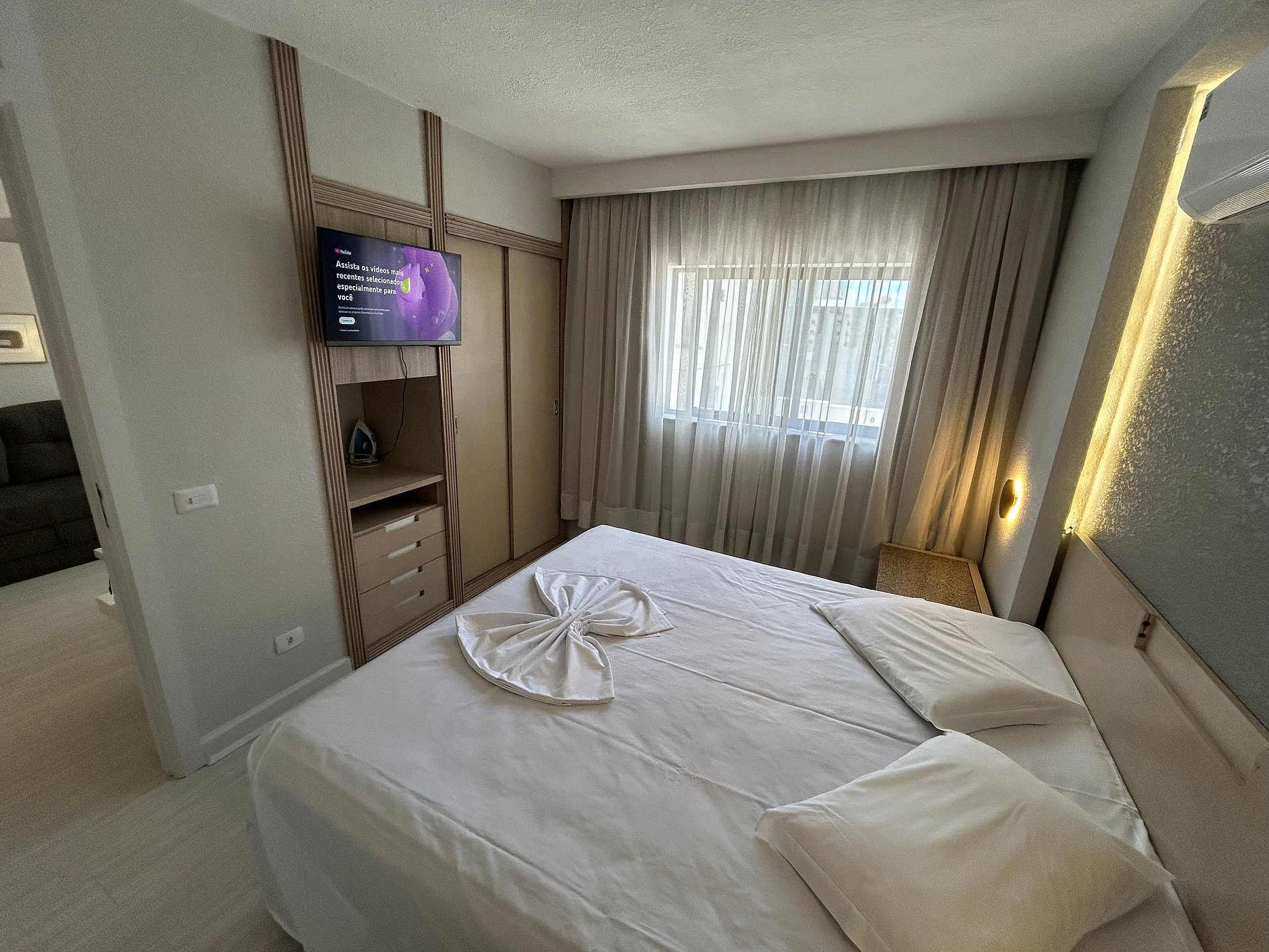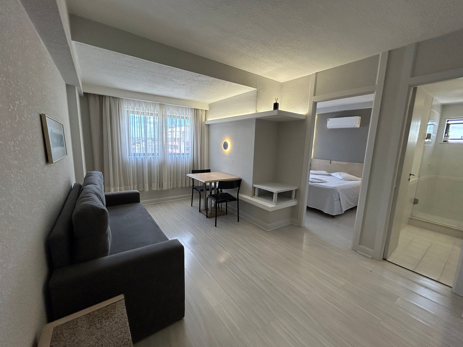 O flat dispõe de uma cama king size e um sofá-cama queen size. Também conta com ar-condicionado quente/frio, frigobar, microondas e utensílios básicos de cozinha. O apartamento fica inteiro e exclusivo só para a pessoa que fez a reserva e seus familiares. Não existe possibilidade de uma pessoa de fora reservar o apartamento ao mesmo tempo para dividi-lo. São fornecidos lençóis, toalhas e cobertores. No edifício, há um restaurante que oferece café-da-manhã (cobrado à parte). Horários de funcionamento: de segunda a sábado, das 7h00 às 10h00 (café-da-manhã) e das 11h30 às 14h30 (almoço). Cada reserva dá direito ao estacionamento gratuito de um veículo de tamanho médio por apartamento (sujeito a disponibilidade). Não há uma vaga específica, pois o estacionamento é rotativo e o motorista estaciona em uma vaga livre e leva a chave. Algumas vagas são maiores e cabem uma S.U.V., mas por ser o estacionamento rotativo não é possível garantir que haverá vagas grandes livres. Caso o veículo seja grande e não haja espaço, há vários estacionamentos na região. Ressaltamos que há menos vagas do que apartamentos, então não há garantia de vaga para todos, sendo que aqueles que chegam mais cedo (em geral, antes das 18h) têm muito mais chance de encontrar vagas.