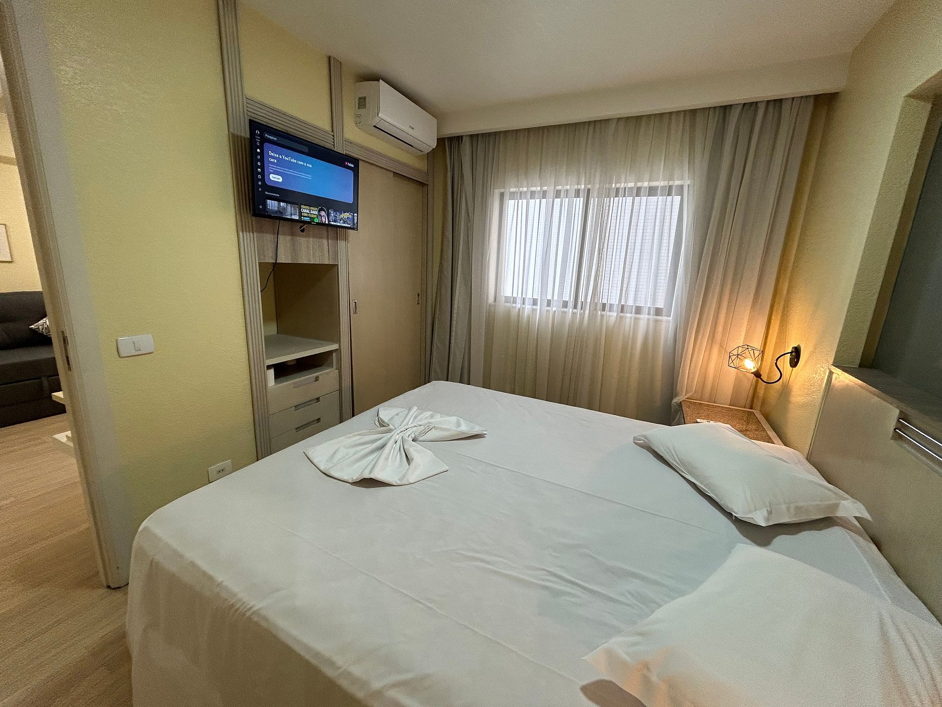 O flat dispõe de uma cama king size. Também conta com ar-condicionado quente/frio, frigobar, microondas, fogão elétrico e utensílios básicos de cozinha. O apartamento fica inteiro e exclusivo só para a pessoa que fez a reserva e seus familiares. Não existe possibilidade de uma pessoa de fora reservar o apartamento ao mesmo tempo para dividi-lo. São fornecidos lençóis, toalhas e cobertores. No edifício, há um restaurante que oferece café-da-manhã (cobrado à parte). Horários de funcionamento: de segunda a sábado, das 7h00 às 10h00 (café-da-manhã) e das 11h30 às 14h30 (almoço). Cada reserva dá direito ao estacionamento gratuito de um veículo de tamanho médio por apartamento (sujeito a disponibilidade). Não há uma vaga específica, pois o estacionamento é rotativo e o motorista estaciona em uma vaga livre e leva a chave. Algumas vagas são maiores e cabem uma S.U.V., mas por ser o estacionamento rotativo não é possível garantir que haverá vagas grandes livres. Caso o veículo seja grande e não haja espaço, há vários estacionamentos na região. Ressaltamos que há menos vagas do que apartamentos, então não há garantia de vaga para todos, sendo que aqueles que chegam mais cedo (em geral, antes das 18h) têm muito mais chance de encontrar vagas.
