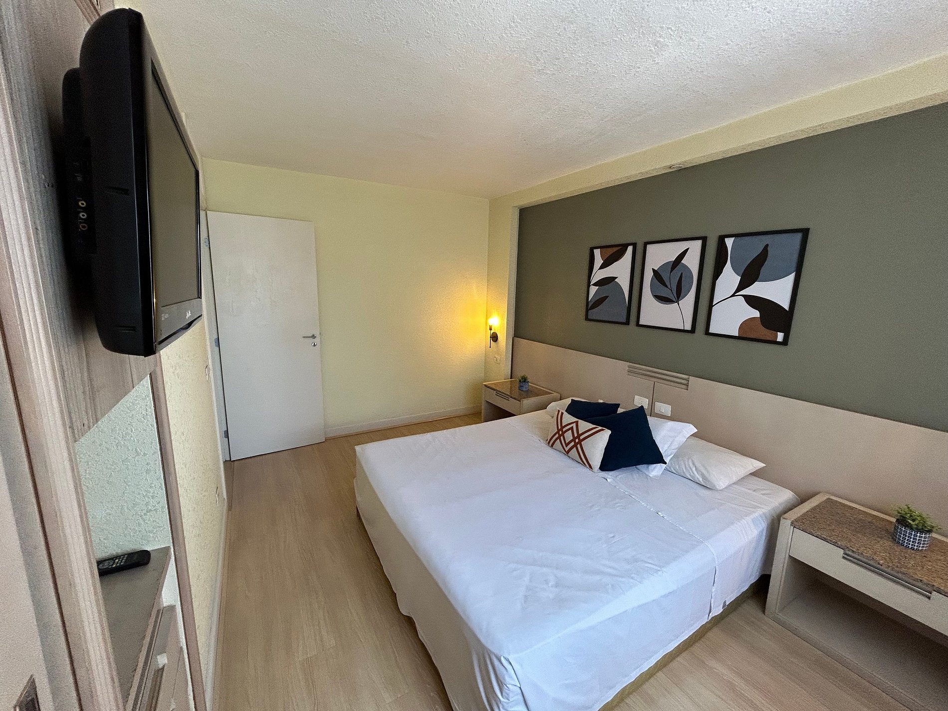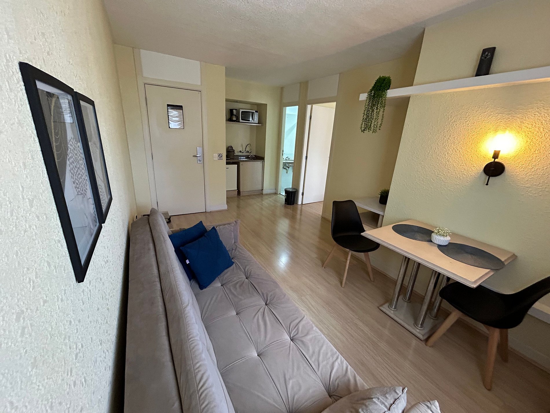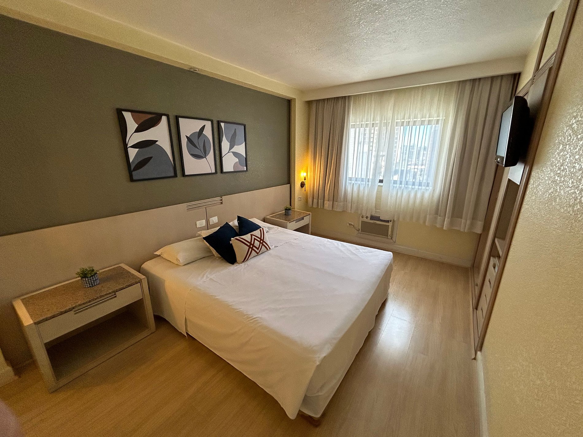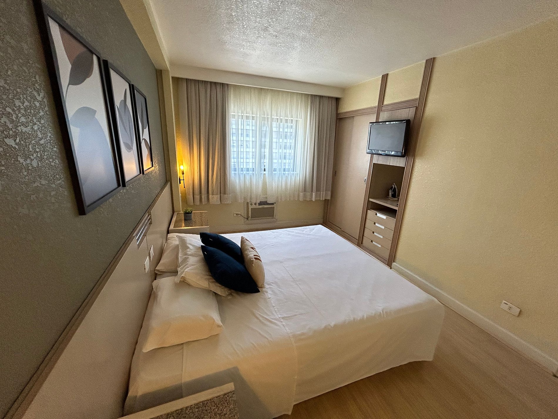 O flat dispõe de uma cama queen size e um sofá-cama. Também conta com ar-condicionado quente/frio, frigobar, microondas e utensílios básicos de cozinha. O apartamento fica inteiro e exclusivo só para a pessoa que fez a reserva e seus familiares. Não existe possibilidade de uma pessoa de fora reservar o apartamento ao mesmo tempo para dividi-lo. São fornecidos lençóis, toalhas e cobertores. No edifício, há um restaurante que oferece café-da-manhã (cobrado à parte). Horários de funcionamento: de segunda a sábado, das 7h00 às 10h00 (café-da-manhã) e das 11h30 às 14h30 (almoço). Cada reserva dá direito ao estacionamento gratuito de um veículo de tamanho médio por apartamento (sujeito a disponibilidade). Não há uma vaga específica, pois o estacionamento é rotativo e o motorista estaciona em uma vaga livre e leva a chave. Algumas vagas são maiores e cabem uma S.U.V., mas por ser o estacionamento rotativo não é possível garantir que haverá vagas grandes livres. Caso o veículo seja grande e não haja espaço, há vários estacionamentos na região. Ressaltamos que há menos vagas do que apartamentos, então não há garantia de vaga para todos, sendo que aqueles que chegam mais cedo (em geral, antes das 18h) têm muito mais chance de encontrar vagas.