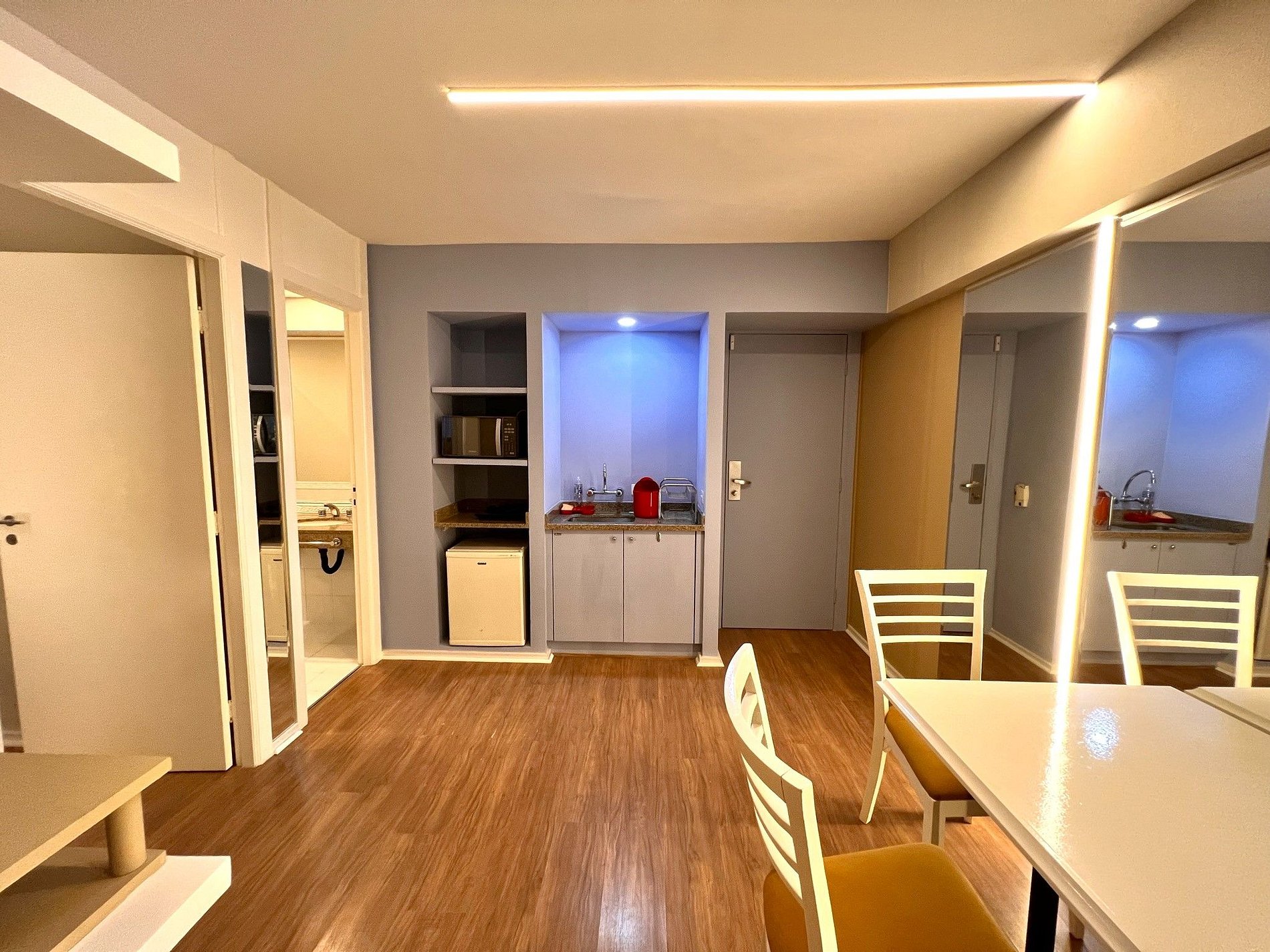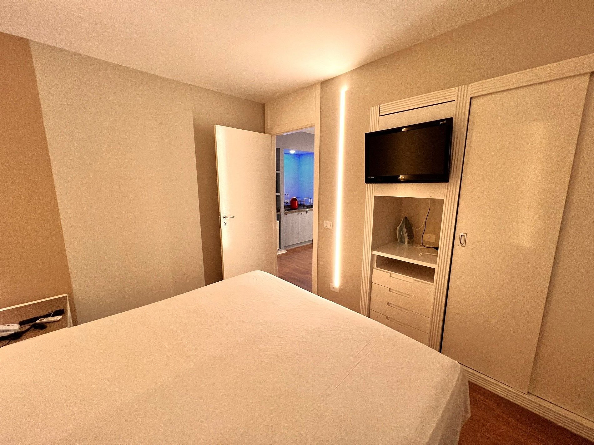 O flat dispõe de uma cama queen size e sofá-cama queen size muito confortáveis. Também conta com ar-condicionado quente/frio, frigobar, microondas, fogão elétrico e utensílios básicos de cozinha. O apartamento fica inteiro e exclusivo só para a pessoa que fez a reserva e seus familiares. Não existe possibilidade de uma pessoa de fora reservar o apartamento ao mesmo tempo para dividi-lo. São fornecidos lençóis, toalhas e cobertores. No edifício, há um restaurante que oferece café-da-manhã (cobrado à parte). Horários de funcionamento: de segunda a sábado, das 7h00 às 10h00 (café-da-manhã) e das 11h30 às 14h30 (almoço). Cada reserva dá direito ao estacionamento gratuito de um veículo de tamanho médio por apartamento (sujeito a disponibilidade). Não há uma vaga específica, pois o estacionamento é rotativo e o motorista estaciona em uma vaga livre e leva a chave. Algumas vagas são maiores e cabem uma S.U.V., mas por ser o estacionamento rotativo não é possível garantir que haverá vagas grandes livres. Caso o veículo seja grande e não haja espaço, há vários estacionamentos na região. Ressaltamos que há menos vagas do que apartamentos, então não há garantia de vaga para todos, sendo que aqueles que chegam mais cedo (em geral, antes das 18h) têm muito mais chance de encontrar vagas.