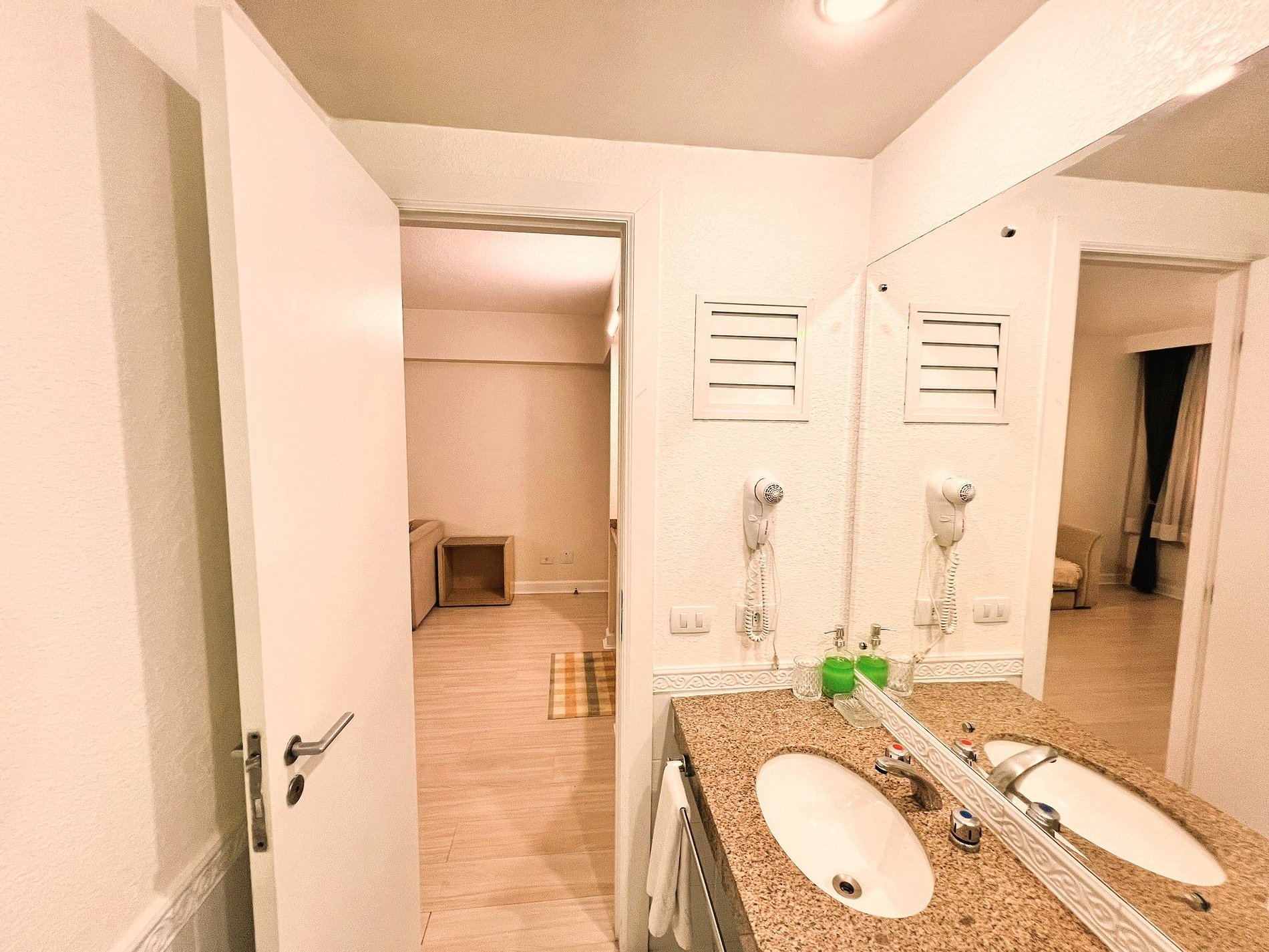 O flat dispõe de uma cama de casal. Também conta com ar-condicionado quente/frio, frigobar, microondas e utensílios básicos de cozinha. O apartamento fica inteiro e exclusivo só para a pessoa que fez a reserva e seus familiares. Não existe possibilidade de uma pessoa de fora reservar o apartamento ao mesmo tempo para dividi-lo. São fornecidos lençóis, toalhas e cobertores. No edifício, há um restaurante que oferece café-da-manhã (cobrado à parte). Horários de funcionamento: de segunda a sábado, das 7h00 às 10h00 (café-da-manhã) e das 11h30 às 14h30 (almoço). Cada reserva dá direito ao estacionamento gratuito de um veículo de tamanho médio por apartamento (sujeito a disponibilidade). Não há uma vaga específica, pois o estacionamento é rotativo e o motorista estaciona em uma vaga livre e leva a chave. Algumas vagas são maiores e cabem uma S.U.V., mas por ser o estacionamento rotativo não é possível garantir que haverá vagas grandes livres. Caso o veículo seja grande e não haja espaço, há vários estacionamentos na região. Ressaltamos que há menos vagas do que apartamentos, então não há garantia de vaga para todos, sendo que aqueles que chegam mais cedo (em geral, antes das 18h) têm muito mais chance de encontrar vagas.