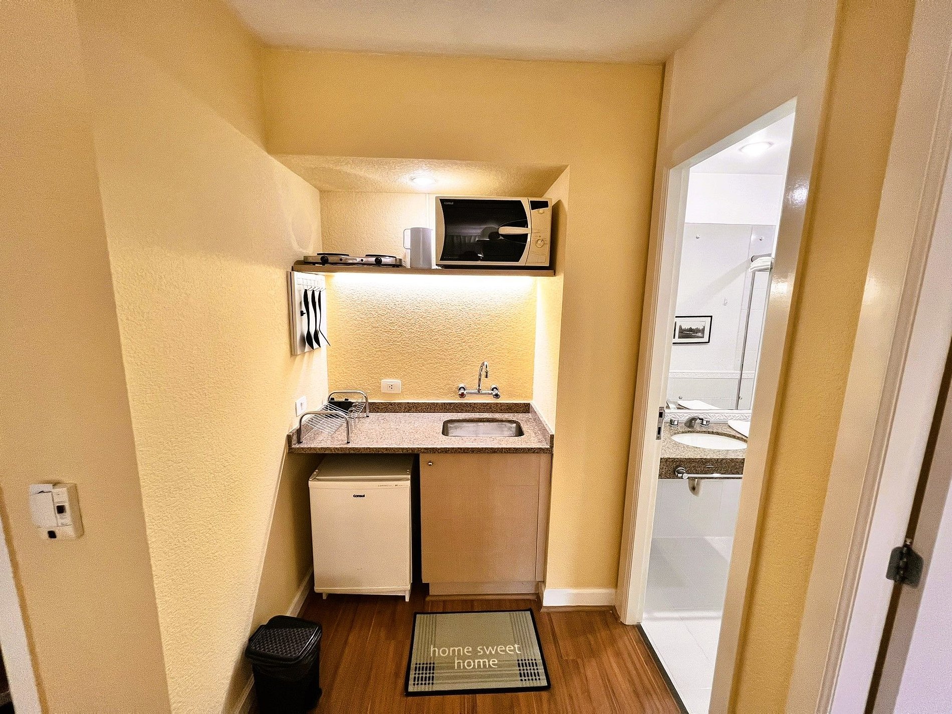 O flat dispõe de uma cama queen size muito confortável. Também conta com ar-condicionado quente/frio, frigobar, microondas e utensílios básicos de cozinha. O apartamento fica inteiro e exclusivo só para a pessoa que fez a reserva e seus familiares. Não existe possibilidade de uma pessoa de fora reservar o apartamento ao mesmo tempo para dividi-lo. São fornecidos lençóis, toalhas e cobertores. No edifício, há um restaurante que oferece café-da-manhã (cobrado à parte). Horários de funcionamento: de segunda a sábado, das 7h00 às 10h00 (café-da-manhã) e das 11h30 às 14h30 (almoço). Cada reserva dá direito ao estacionamento gratuito de um veículo de tamanho médio por apartamento (sujeito a disponibilidade). Não há uma vaga específica, pois o estacionamento é rotativo e o motorista estaciona em uma vaga livre e leva a chave. Algumas vagas são maiores e cabem uma S.U.V., mas por ser o estacionamento rotativo não é possível garantir que haverá vagas grandes livres. Caso o veículo seja grande e não haja espaço, há vários estacionamentos na região. Ressaltamos que há menos vagas do que apartamentos, então não há garantia de vaga para todos, sendo que aqueles que chegam mais cedo (em geral, antes das 18h) têm muito mais chance de encontrar vagas.